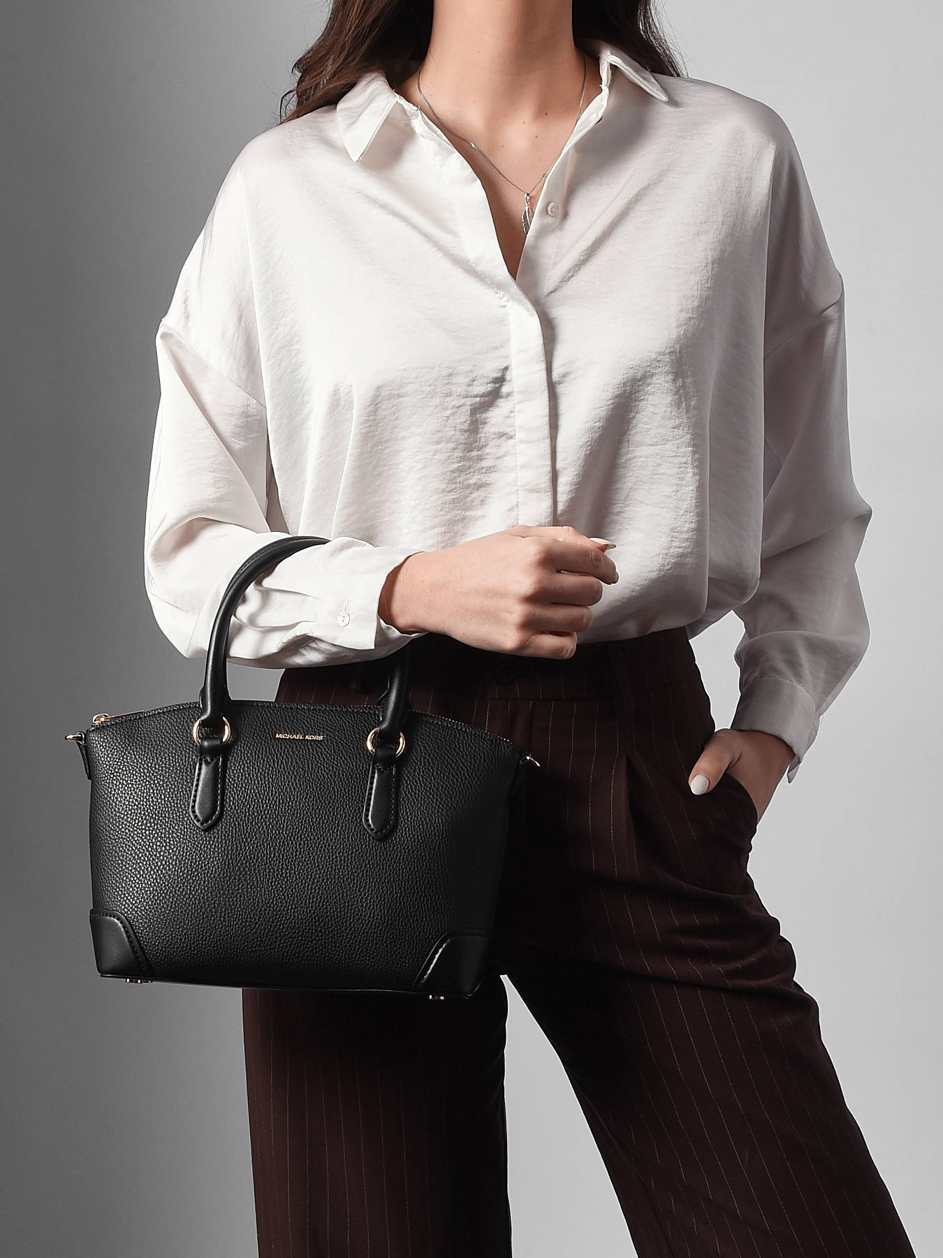 The MURPHY handbag by MICHAEL KORS is made from durable and stylish coated canvas. It features a secure zip closure to keep your belongings safe. The handle height is 10 cm, providing a comfortable hand carry. This versatile bag comes with an adjustable and removable shoulder strap, allowing you to wear it either by hand or crossbody as you prefer. Inside, it offers one spacious compartment with a zippered pocket for practical organization of your essentials. A chic and functional bag, perfect for stylish everyday use.